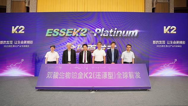 双骏生物首席科学家、首席科学官、董事总经理陈杰鹏博士在题为《科学·商业的前沿 健康的前沿》的演讲中介绍,双骏生物凭借36年的技术创新与积累,始终坚持以超国家标准的高水平内控标准引领品牌原料及产品的品质,生产纯度99.95%的黄金K2和铂金K2(还原型),拥有欧洲、美国、日本、中国近30项发明专利,并斩获欧盟新资源食品、美国GRAS Self、FDA认证等多项国际权威认证。同时,双骏生物在推动维生素K2国家标准的制定与完善,开展临床真实世界研究,发表研究论文、出版科普书籍,成立维生素K2科研基金,不断引领维生素K2(MK-7)品类高质量发展,实现“科研—标准—产业”的良性循环。