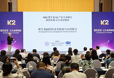 清华大学(台湾)生物科技研究所荣退教授黎耀基教授通过《维生素K2的抗衰老机制与应用潜力》主题演讲介绍,维生素K2具有抗氧化、抗炎和维持钙稳态的作用,并以此帮助机体对抗年龄相关疾病,如骨质疏松、心血管疾病、糖尿病和神经退化等。此外,维生素K2还起到促进伤口愈合、加速胶原蛋白生成等作用,在皮肤护理领域具有一定发展潜力,尤其是还原型维生素K2,在高端医美及护肤品行业中的应用展现出显著的升级效应和市场带动性,成为行业增长的新引擎。维生素K2有望纳入未来健康老化、延缓慢病、提升健康寿命的整体营养策略。