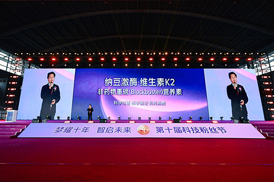 双骏生物首席科学家、首席科学官、董事总经理陈杰鹏博士发表题为《纳豆激酶·维生素K2 非药物重磅(Blockbuster)营养素——科学可证·科学循证·阳光消费》的主题演讲。陈博士表示,作为纳豆产业的领跑者,双骏生物以36年生物发酵技术底蕴与17年纳豆制造平台的深厚积淀,不仅以自主专利的液态发酵、膜处理工艺、温度保护蛋白及促进吸收工艺引领技术革新,更推动制定了纳豆激酶的地标、团标、行标及维生素K2国家标准。双骏生物纳豆激酶原料活性达65,000FU/g,制剂产品应用国际创新的肠溶剂型;纯度99.95%的天然全反式维生素K2(MK-7),制剂产品采用全球创新液态生产线,应用液体K2剂型,不断以科研创新与严苛标准推动纳豆激酶与维生素K2品类发展。10年耕耘让“0”成为丰盈的果实,摘掉“0”,又是一个“1”的开始,双骏生物将站在新的起点,以更多突破性创新成果,为民众健康贡献“东方智慧”。